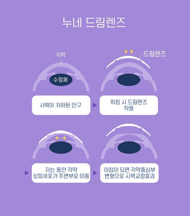 취침시 착용 가능한 시력교정 제품입니다. 1988년 처음으로 FDA 승인 산소 투과성 재료로 맞춤화되었습니다. 특수접점으로 각막 중앙 수정체를 눌러 각막의 모양을 바꾸어 일시적으로 시력을 변화시켜 근시 및 난시를 교정하는 원리입니다.