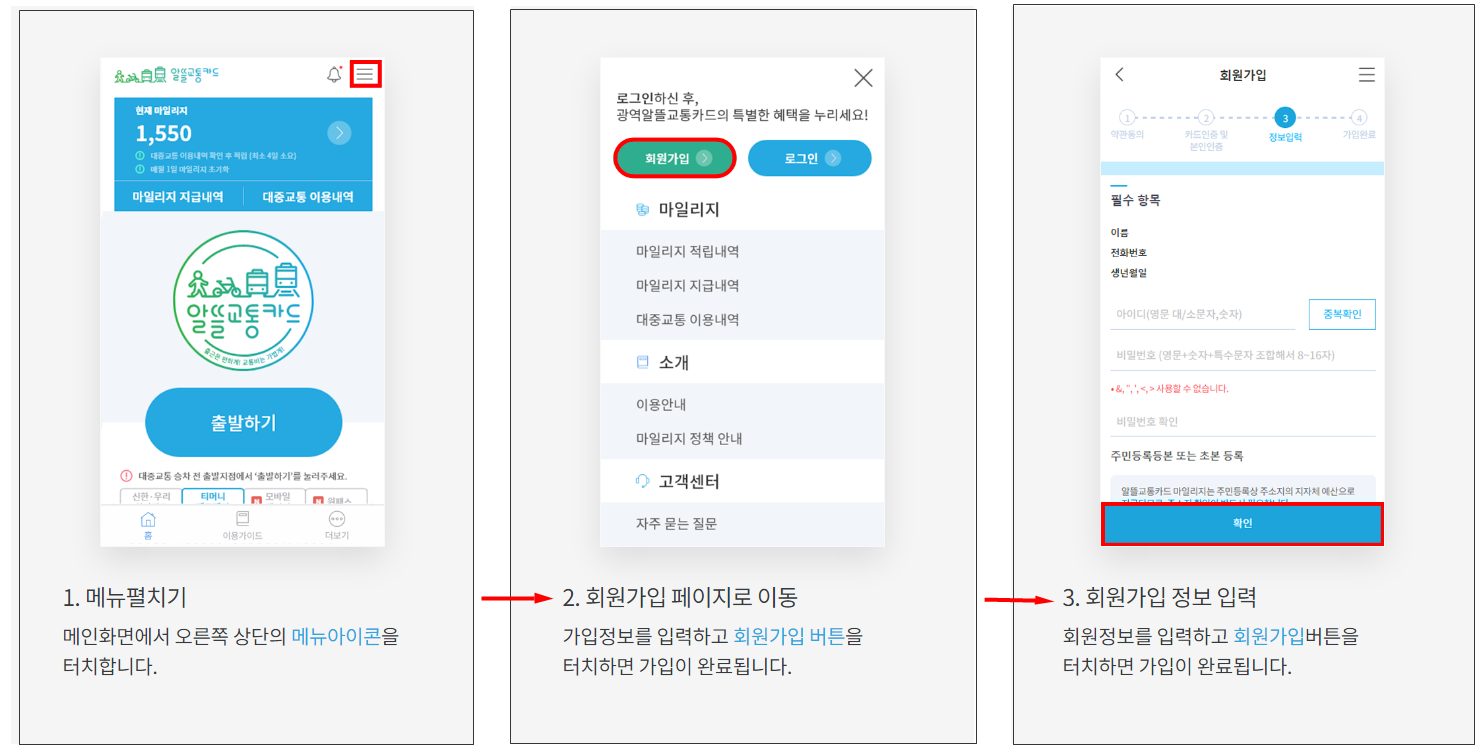이 순서대로 하시면 알뜰교통카드 앱을 이용하실 수 있습니다.