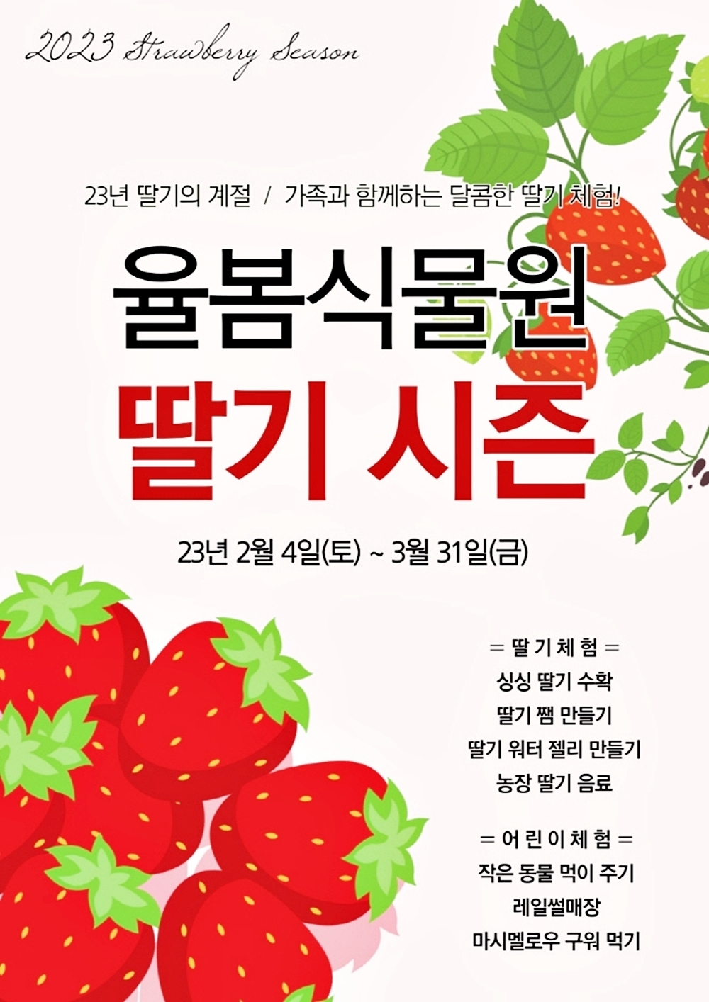 경기도 광주 율봄식물원에서 열리는 딸기축제는 딸기 수확체험 뿐만 아니라 다양한 커리큘럼이 준비되어 있어 지루하지 않은 시간을 보낼 수 있을 것 같습니다.
