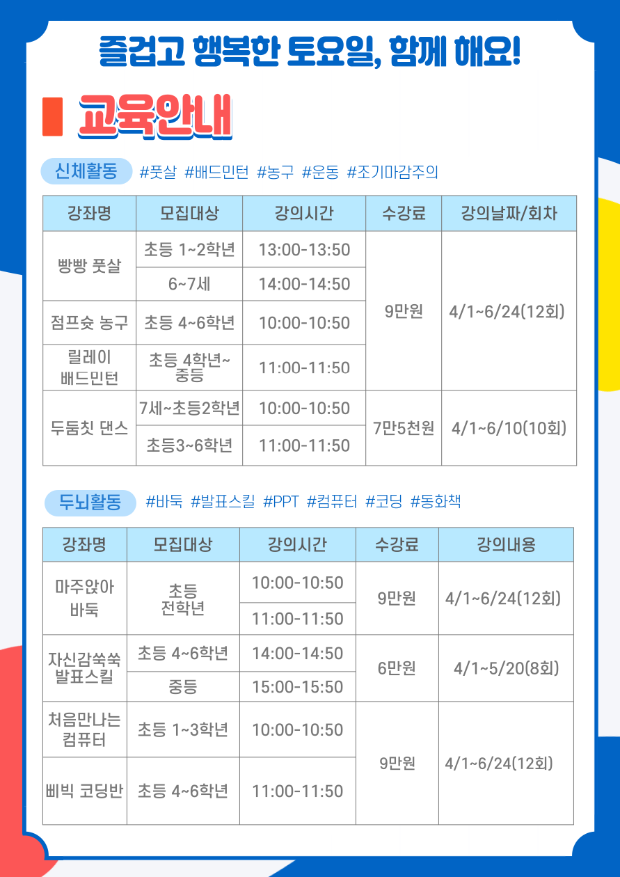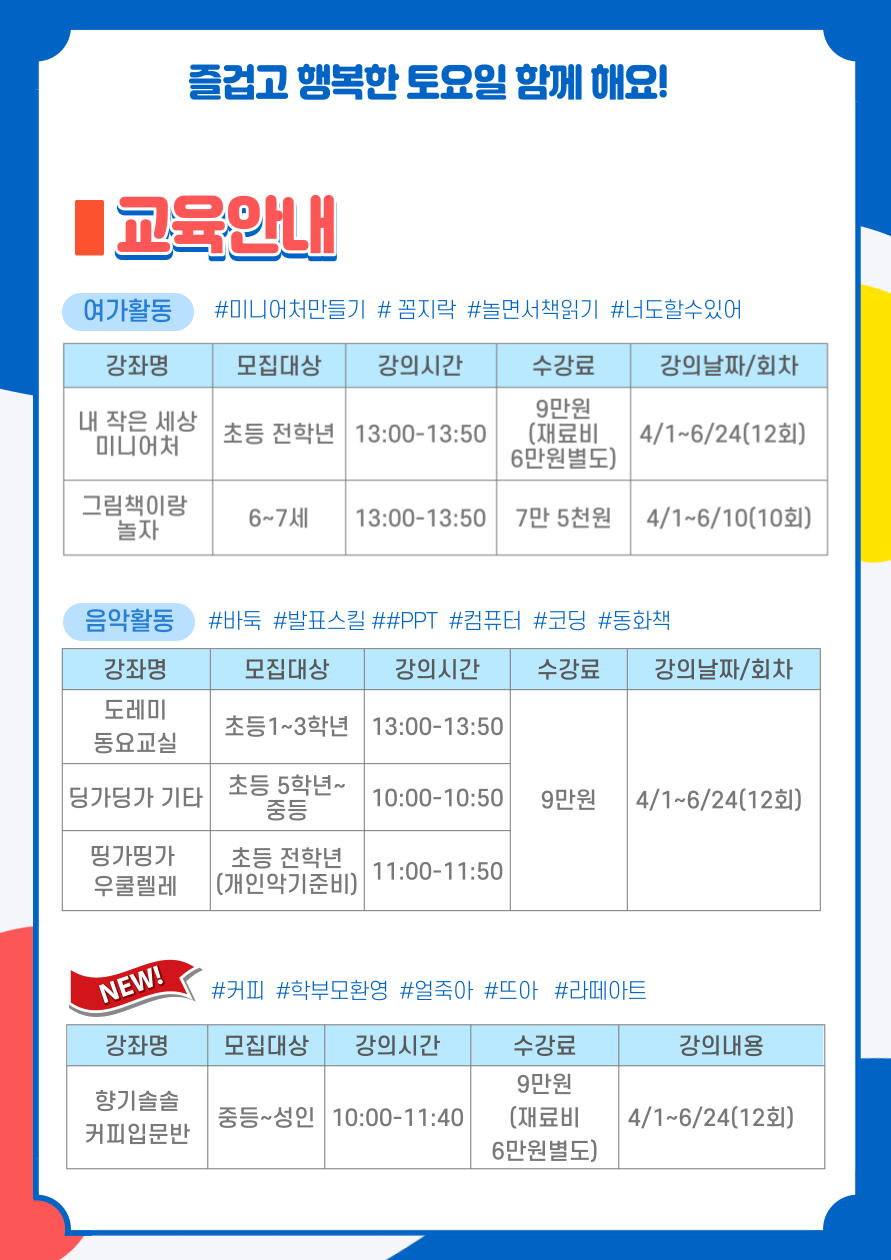 안녕하세요, 2023년 봄학기 프로그램에 많은 관심 부탁드립니다. 여러분의 일상을 즐겁고 신나게 만들어드릴 다양한 프로그램을 준비했습니다! 모든 프로그램은 토요일에 진행되며 코스명과 시간은